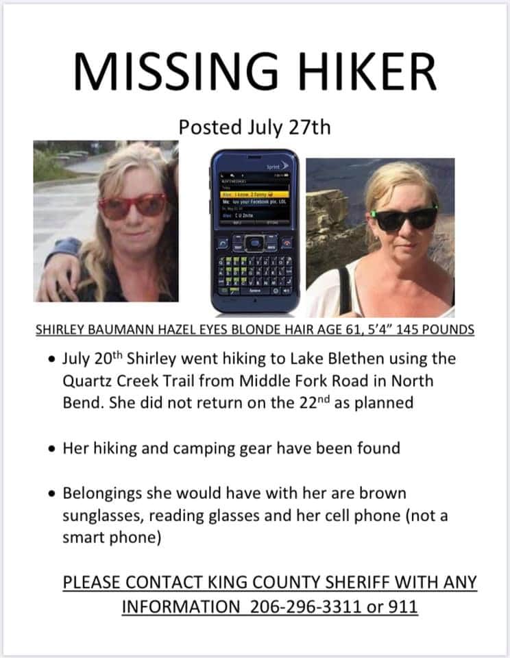 Friend and family of North Bend resident Shirley Baumann are still looking for answers to her disappearance after she went hiking to Lake Blethen on July 20, 2020 and didn’t return on July 22nd as planned.
