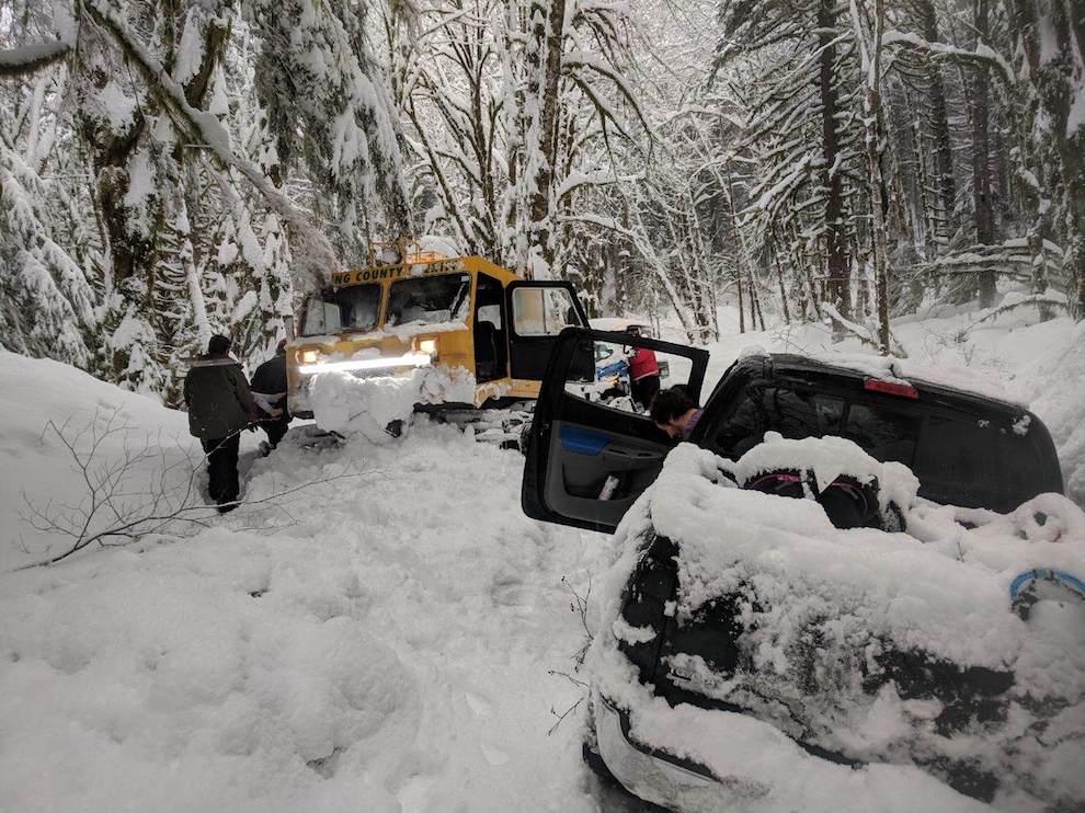Late Tuesday afternoon – around 4:15PM – King County Sheriff’s Office and King County Search and Rescue, with the use of the KCSO Snowcat, located the four adults and child safe in their vehicle awaiting rescue.