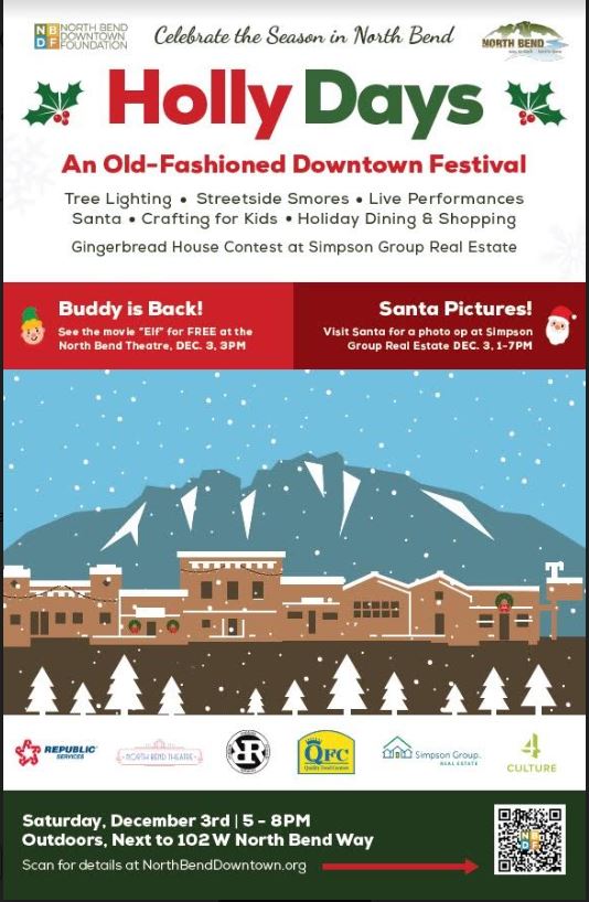 Visitors can shop and dine with our downtown businesses while keeping an eye out for Santa, who will be welcoming free photo ops, thanks to Simpson Group Real Estate. Enjoy an early start to Holly Days with a free feature of ELF at the North Bend Theatre, starting at 3:00 p.m.