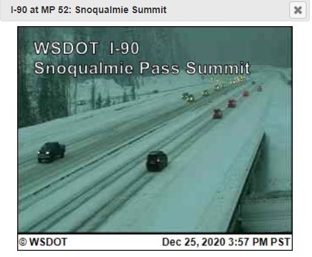 I-90 eastbound remains closed at milepost 34 near North Bend 18 miles west of the summit, due to multiple spin-outs and jack-knifed vehicles.