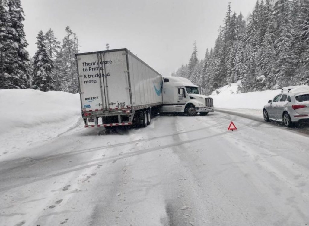 I-90 is open both directions with chains required (all vehicles except AWD/4WD). A jackknifed semi was blocking westbound near the summit but was quickly CLEARED.