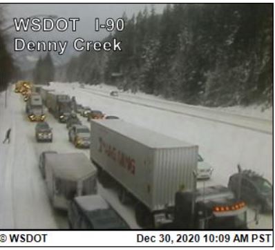 UPDATE: 12:07 pm I-90 has reopened eastbound with chains required on all vehicles except 4WD/AWD in both directions. Snowing heavily at times.