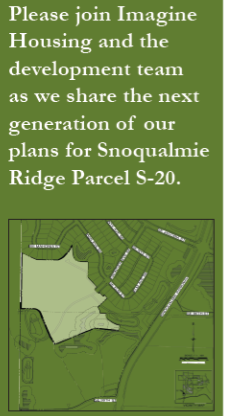 Imagine Housing and the development team are asking Snoqualmie residents to join them as they “share the next generation of our plans for Snoqualmie Ridge Parcel S-20.”