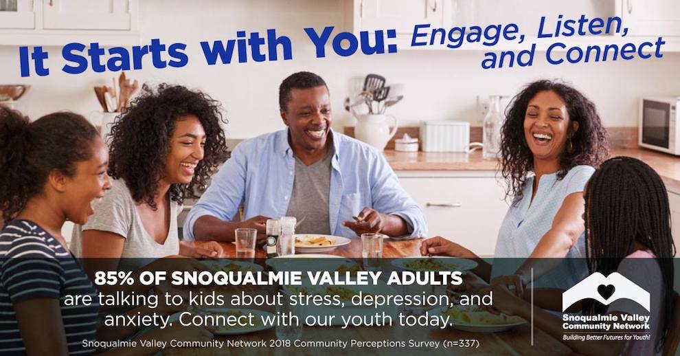 In December, The Snoqualmie Valley Community Network kicked off its important It Starts with You: Engage, Listen and Connect social media campaign, with the goal of encouraging Snoqualmie Valley adults to connect with local youth.