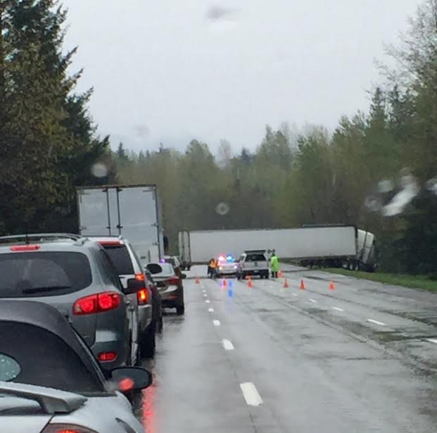Around 2PM, a semi truck jackknifed, blocking two of the three eastbound I-90 lanes at milepost 31 just before North Bend. The cab of the truck ended up past the guardrail and over the roadside shoulder.