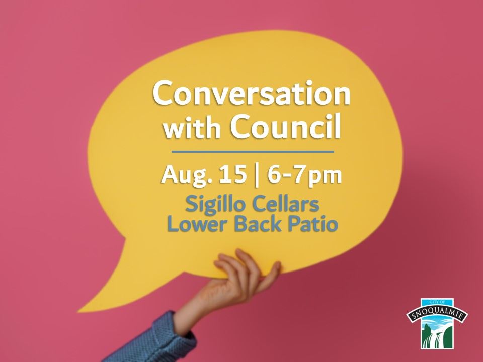 Snoqualmie residents are invited to a relaxed evening of conversation with City Councilmembers Ethan Benson, Catherine Cotton, Louis Washington, and Rob Wotton on Thursday, August 15, 2024.