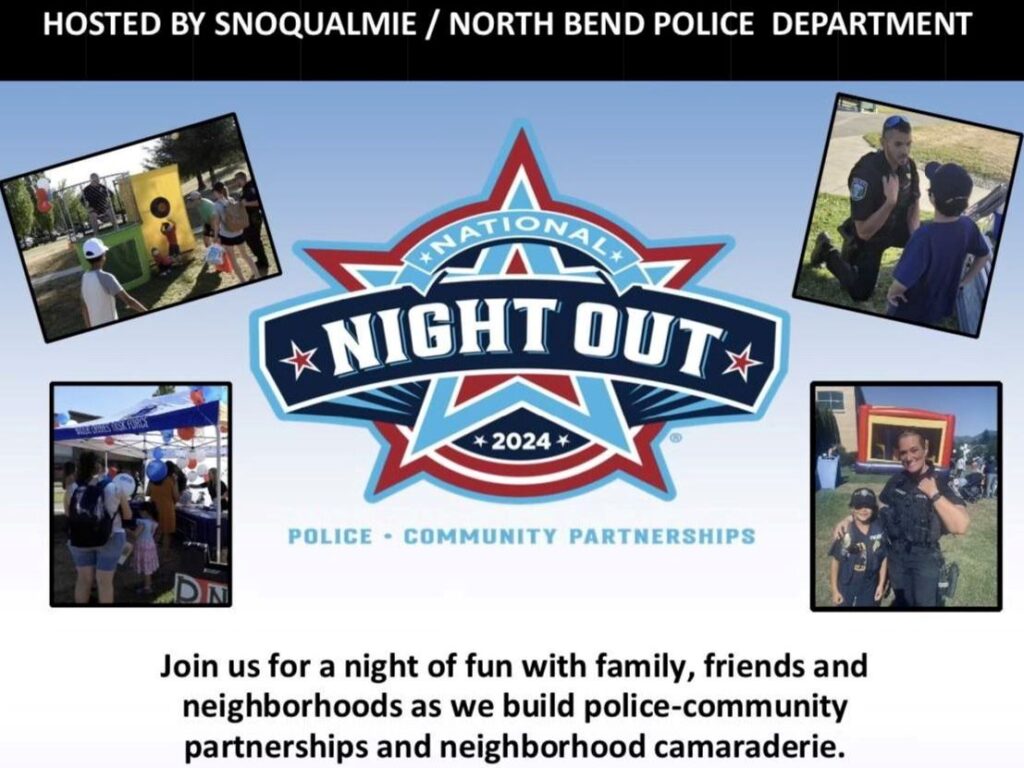 This year’s event features live music, a dunk tank, bouncy houses, face painting, hot dogs, ice cream, and more. Residents of North Bend and Snoqualmie are invited to join SnoPo officers and their neighbors for a memorable evening of family fun at Si View Park, located at 400 SE Orchard Drive.