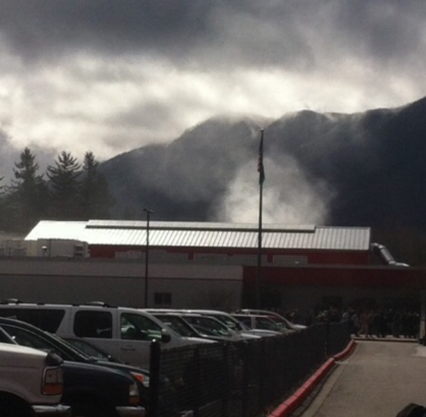 Smoke comes from roof area of Mount Si HS, 3/20/14. Photo: Bailey Scott
