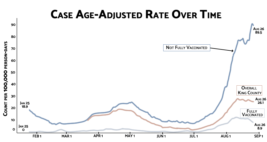 Since July, COVID-19 cases have increased rapidly in King County. The worsening outbreak is affecting all of us. People who are not fully vaccinated are getting seriously ill and dying at much higher rates than the vaccinated population.