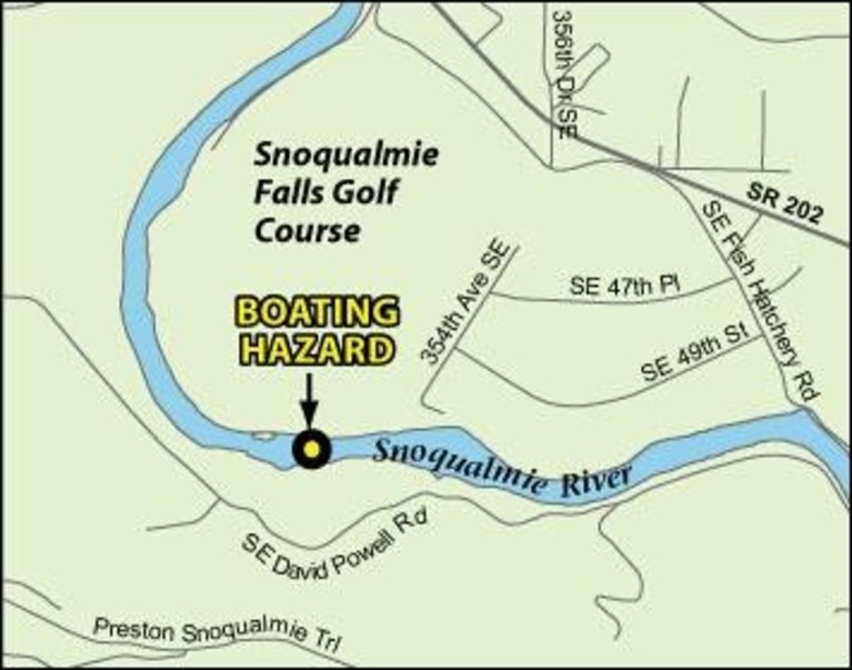 On the Snoqualmie River at River Mile 36.1 – on the bend before the Snoqualmie Falls Golf Course in Fall City – there is a large tree and branches/brush hazard along the river bank.