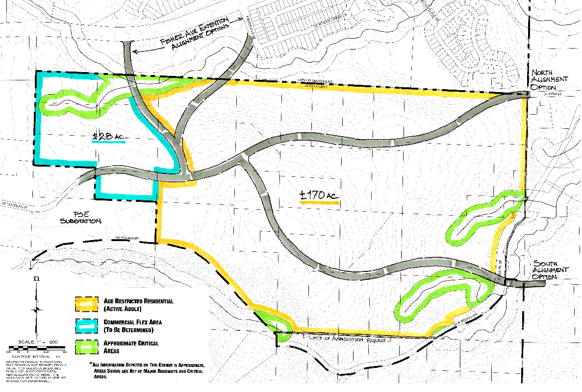 Snoqualmie Hills conceptual site map. Not all of possible annexation land is build-able. Acres in green are wetland/open space/critical areas. Conceptual options for roads are in gray.