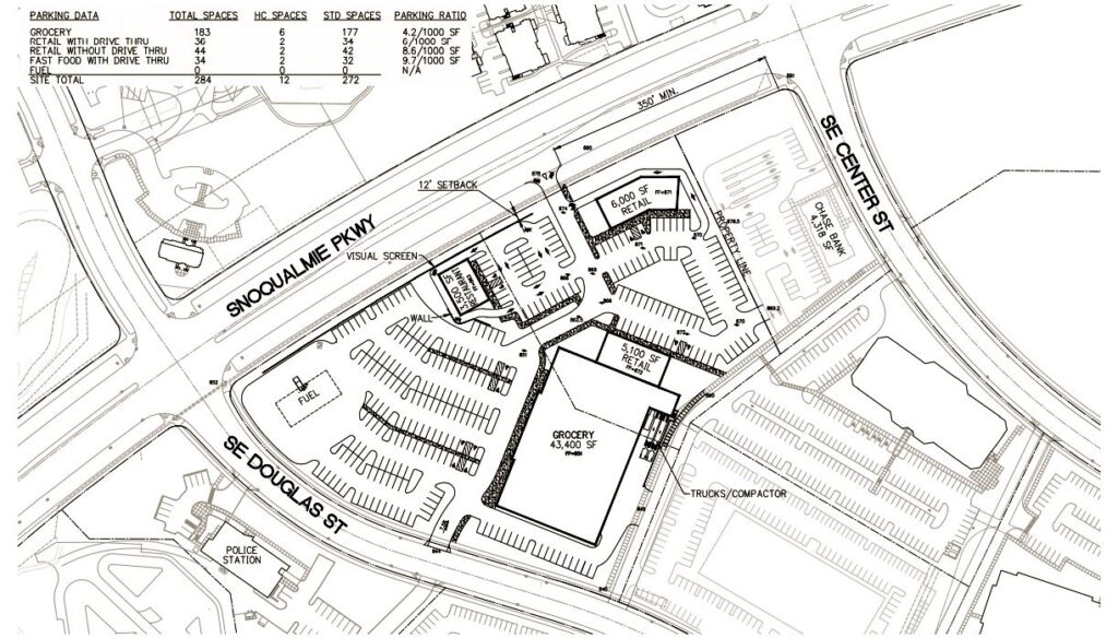 The proposed retail center would be anchored by a 43,400 sq. ft. grocery store – or about twice the size of the Snoqualmie Ridge IGA – and also include drive-thru retail, drive-thru fast food, retail without a drive thru and a fuel sales element associated with the grocery store.