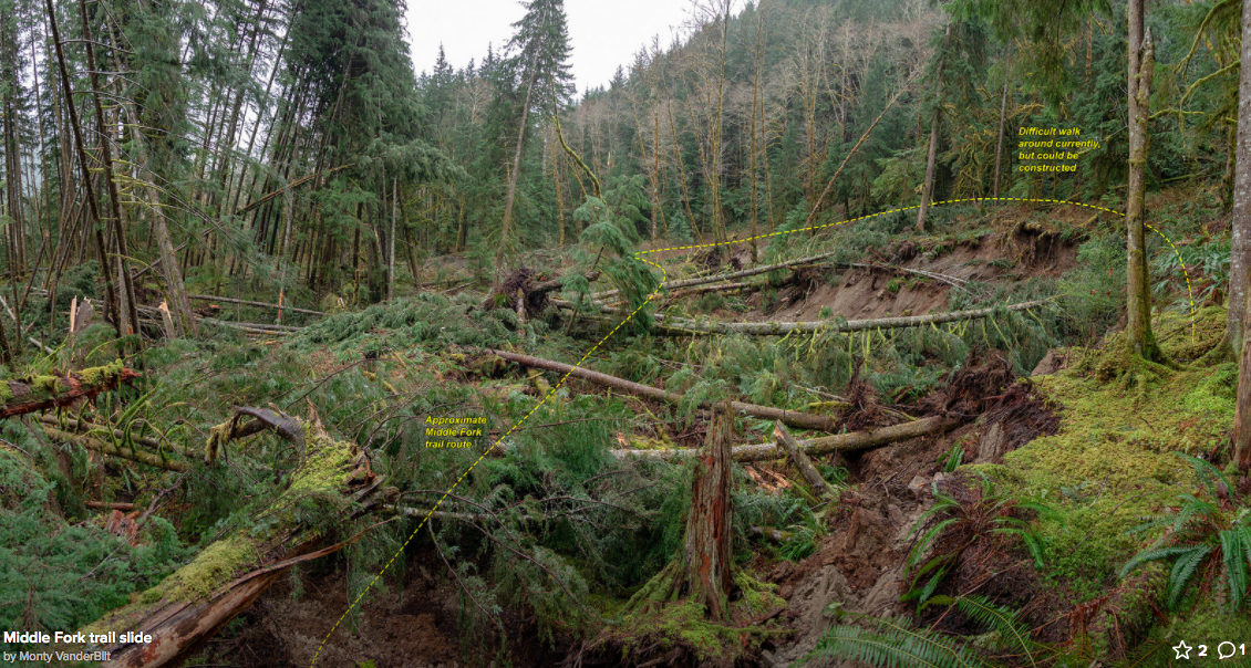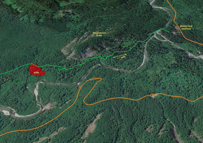 Per the Mt.Baker-Snoqualmie National Forest Ranger District alert: “Following a significant slide across the Middle Fork Trail, hazardous conditions require a closure of the trail to ensure public safety.”