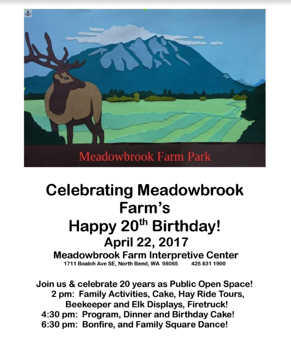 To celebrate those 20 years, a party is being thrown in Meadowbrook Farm’s honor – this Saturday, April 22, 2017. It will be a day of fun, family activities, including hay ride tours, bee keeper and elk displays, a bonfire, a dinner, square dancing, and cake, of course!