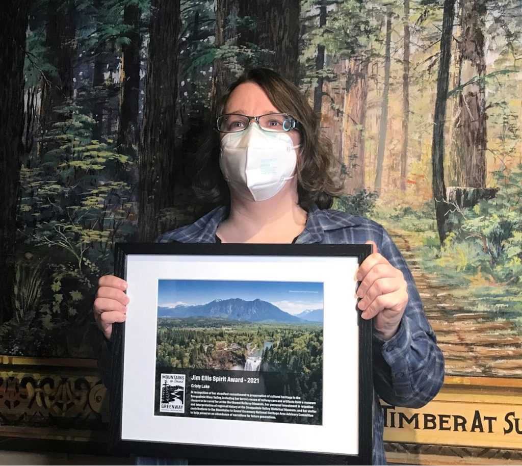 Cristy Lake, Assistant Director of the Snoqualmie Valley Historical Museum and Collections Registrar at the Northwest Railway Museum, was honored with the Jim Ellis Spirit Award at the annual Mountains to Sound Greenway Trust (MTSGT) Celebration on December 4th in recognition of her steadfast commitment to the preservation of cultural heritage throughout the Snoqualmie Valley.
