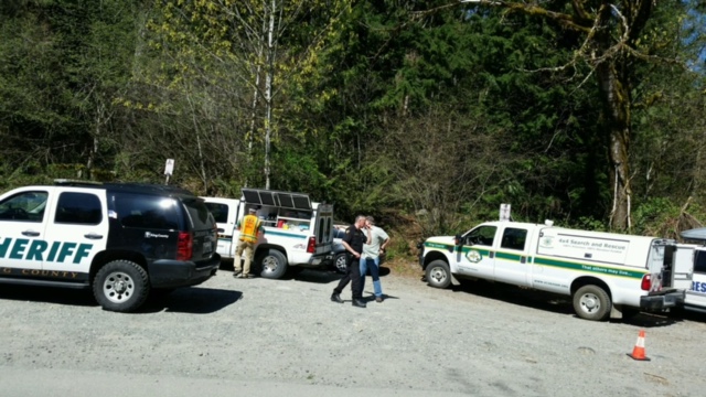 King County SAR crews at Mt. Teneriffe trail for man who fell into a creek bed, possibly breaking his collarbone, 4/7/16.