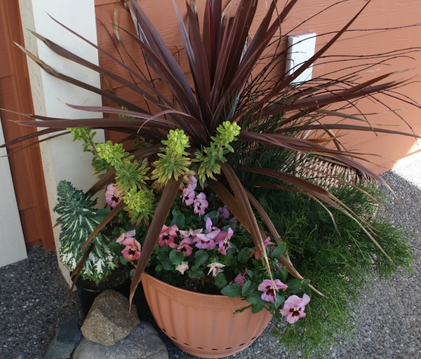 The three key elements in a successful container designing are simple. You’ll need 1) the Thriller, 2) the Filler, and 3) the Spiller…. simple. This recipe works every time. It’s also important to consider leaf texture, color and size – try to vary each. The photo is of a container by my front door and is a good example of Thriller, Filler and Spiller. This container in the sun: Thriller – New Zealand Cabbage Tree (Cordyline australis ‘Burgundy Spire’); Filler – Ascot Rainbow Spurge (Euphorbia martinii ‘Ascot Rainbow’); and Spiller – Creeping Juniper (Juniperus horizontalis). Each has a unique quality (color and texture), but all have the same sun-loving conditions. You can get even more creative by adding in a splash of color from assorted annuals like the pansies pictured here. Happy planting!