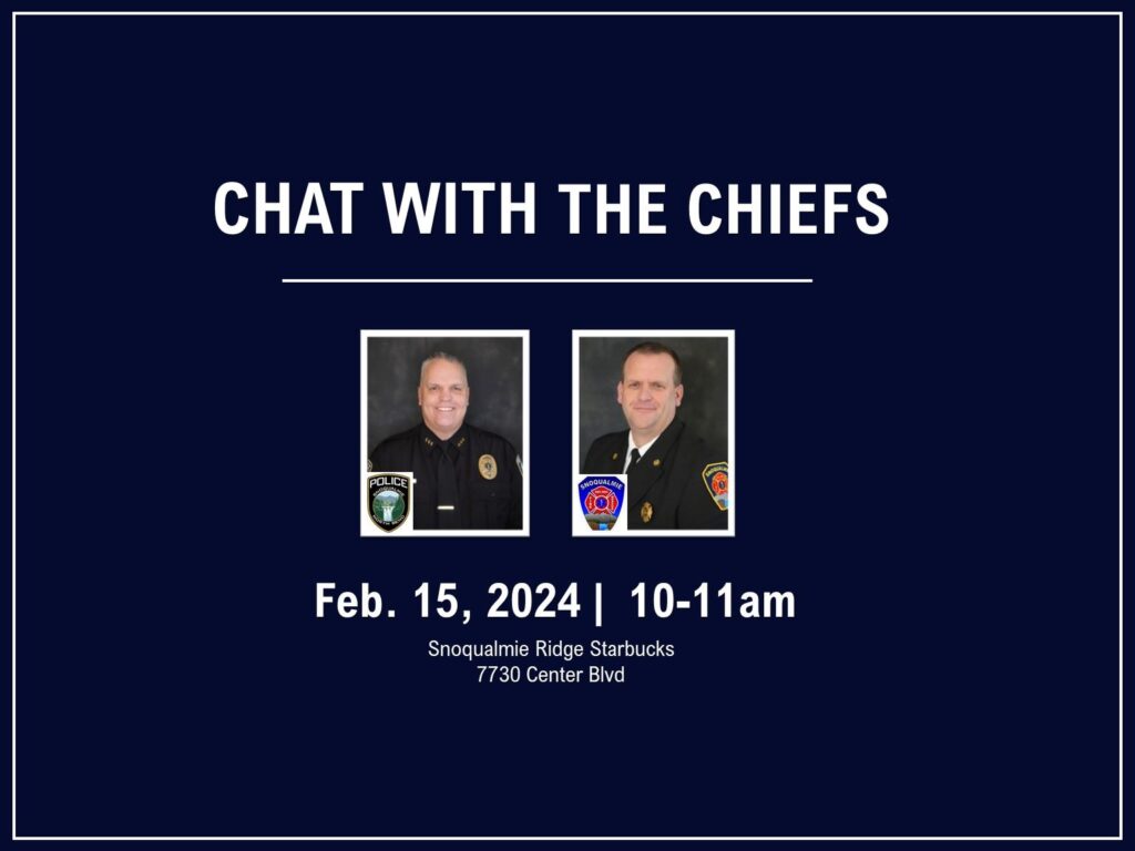 On February 15, 2024, Valley residents are invited for a coffee and conversation session with Fire Chief Mike Bailey and Police Chief Brian Lynch. The meeting will occur at the Snoqualmie Ridge Starbucks, 7730 Center Blvd, next to Dollar Tree, from 10 am to 11 am.