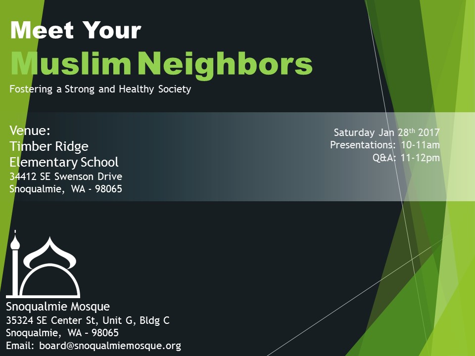 Many attendees requested the Snoqualmie Mosque bring the event back this year, but to a bigger venue. So the 2017 ‘Meet Your Muslim Neighbor’ event will be held at Timber Ridge Elementary, 34412 SE Swenson Drive, on Saturday, January 28th from 10AM – 12PM.