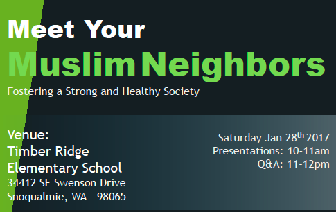 Many attendees requested the Snoqualmie Mosque bring the event back this year, but to a bigger venue. So the 2017 ‘Meet Your Muslim Neighbor’ event will be held at Timber Ridge Elementary, 34412 SE Swenson Drive, on Saturday, January 28th from 10AM – 12PM.