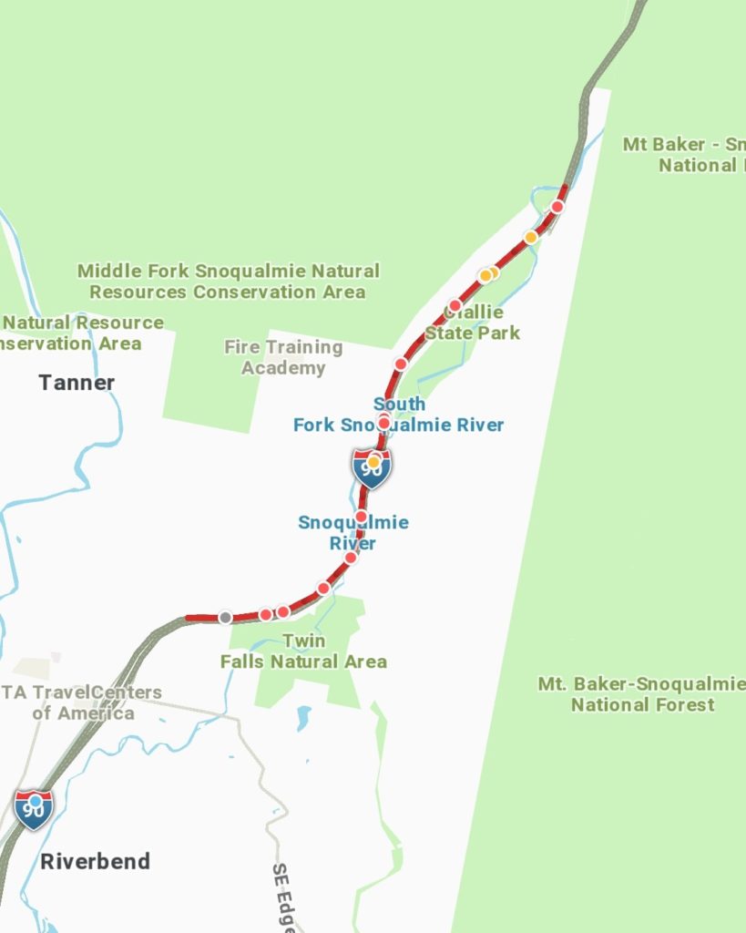 Update 7 PM: On I-90 westbound just east of 468th Ave SE (MP 33) there is a collision blocking all lanes.