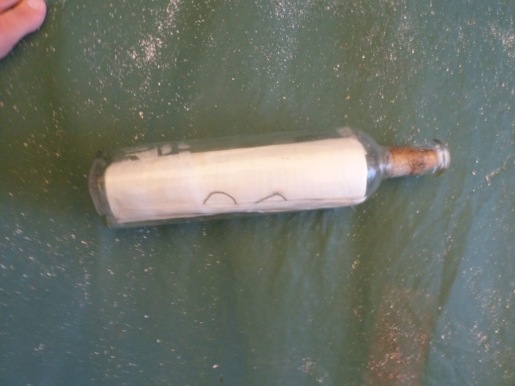 Mino wrote: “Walking over to the bottle I pick it up and examine the contents. Instantly I realize what I’ve found: a message in a bottle. Inside are rolled up pieces of paper, and on further examination I can make out some typed words. Excitement takes a hold of me, and I wave the bottle in the air for my teammate to see offshore. Packing the bottle away, I finish the survey and meet the small boat to get on and we head back to camp.“