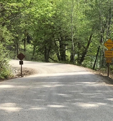 “Repairs are complete”. Really? Of note, there are two sections of gravel road, and 2 large temporary culverts under the road which create two large dips. Cyclists with puncture prone tires can’t go beyond the “fix” point without walking their bikes.