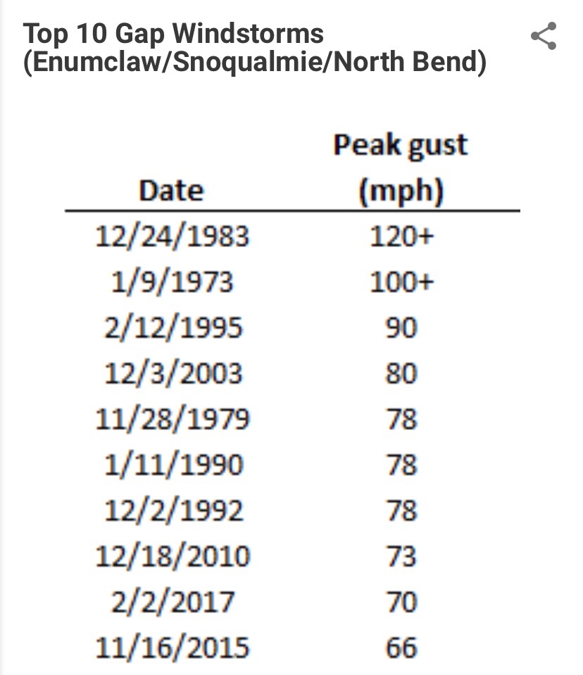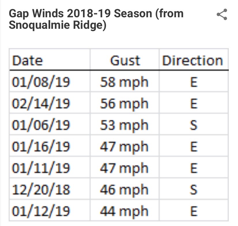 For a few days now, Snoqualmie Weather’s Ryan Porter has been watching the potential for a pretty strong Snoqualmie Valley gap wind event – and it looks like the computer weather models now have consensus that we’re going to have some strong wind [gusts] on Wednesday, January 15th. The National Weather Service also has issued a High Wind Warning.