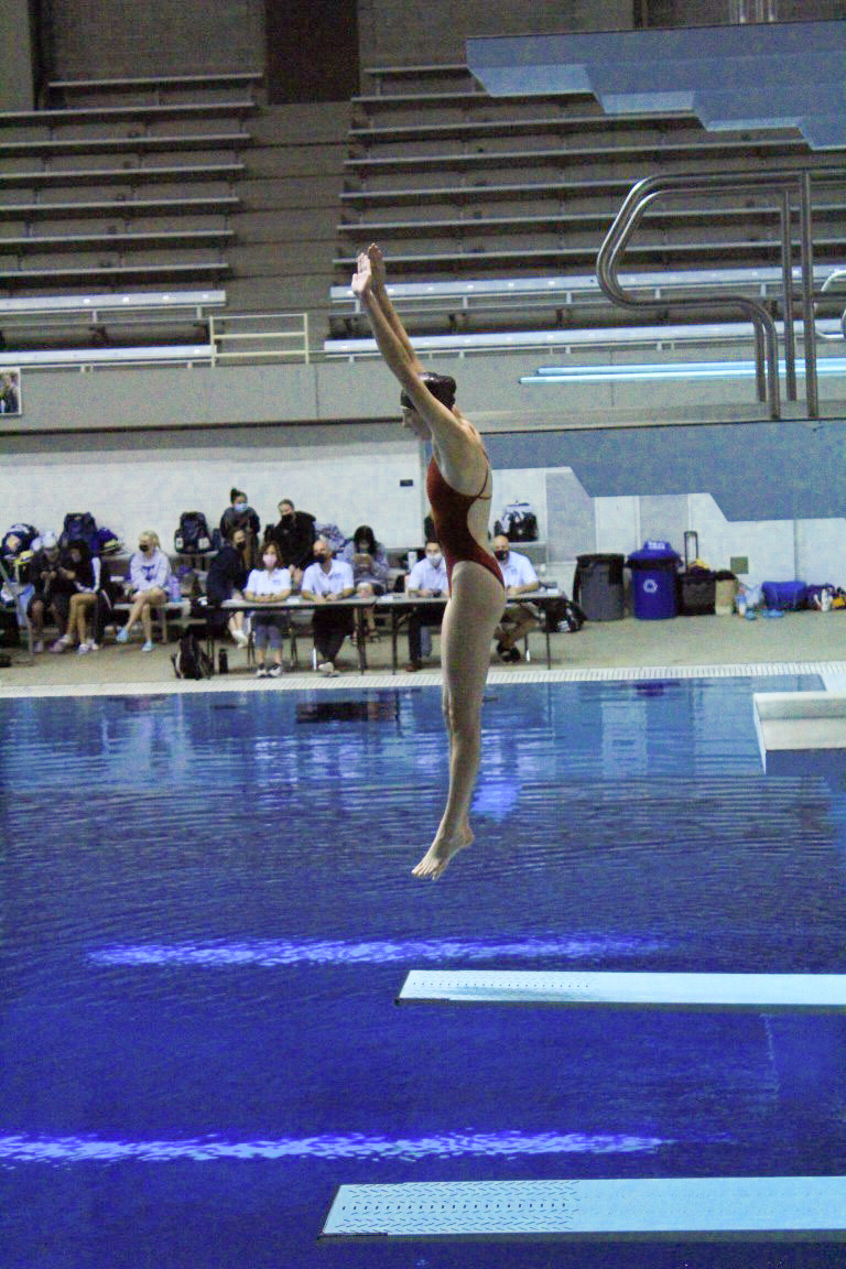Kaitlyn started with a diving club to train year-round, where she gained valuable competition experience, but then Covid hit her junior year. The pandemic, according to Kaitlyn, “definitely took a toll on my training.” So, she worked out 3-4 days a week at a dryland facility because the pools were not open.