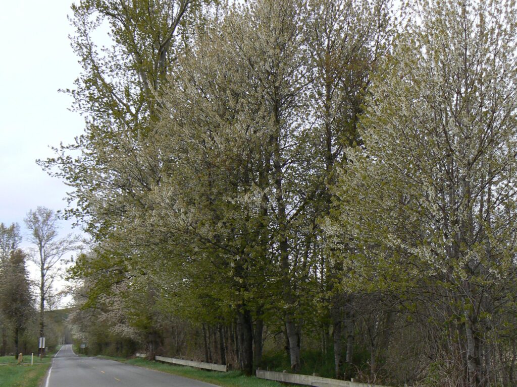 Let’s focus on the cherry, an excellent example of God and the birds taking over. Once the Luellings trees bore fruit, the birds spread the seeds far and wide. As pioneers moved north into what is now the State of Washington, European cherries, seeded by the birds, preceded them. Not all seedling cherries are ‘marketable,’ but the birds don’t mind, so the trees spread ahead of the pioneers and fanned out from pioneer population centers.