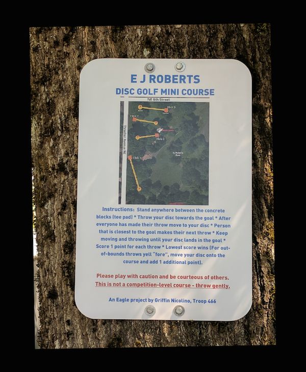 Sign explaining new disc golf mini course at EJ Roberts Park.