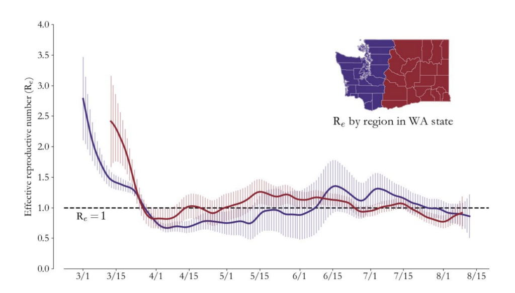 - The reproductive number (how many new people each COVID-19 patient will infect) remained close to one as of mid-August. DOH said the best estimate of the reproductive number as of mid-August was 0.86 in western Washington and 0.91 in eastern Washington. Health officials say the goal is a number well below one, translating to COVID-19 transmission declining.