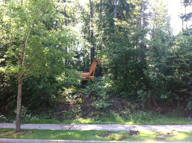 Bobcat-type bulldozer works on land parcel on corner of Snoqualmie Parkway and Swenson Drive, at the entrance to Deer Park neighborhood