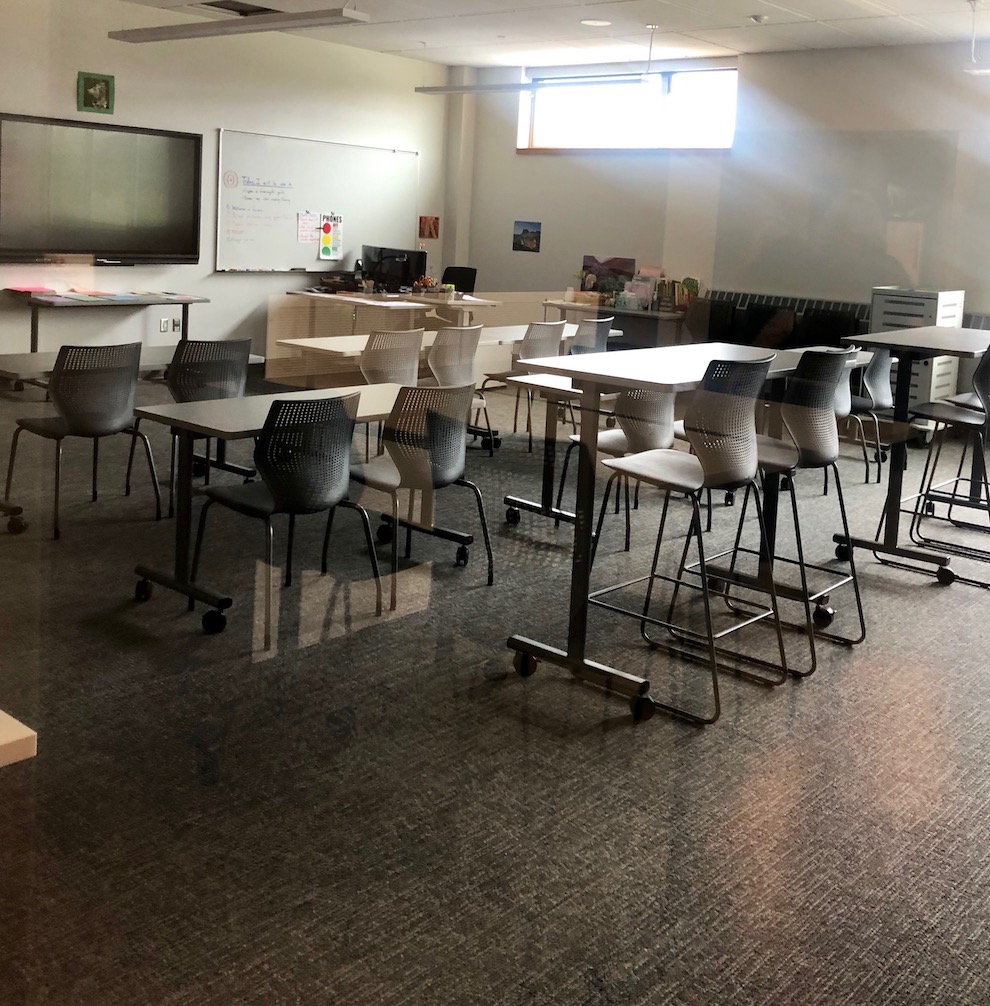Each classroom wing comes with common, breakout areas with comfortable furniture. No one is lost in the back of the classroom – back rows all have higher desks and chairs.