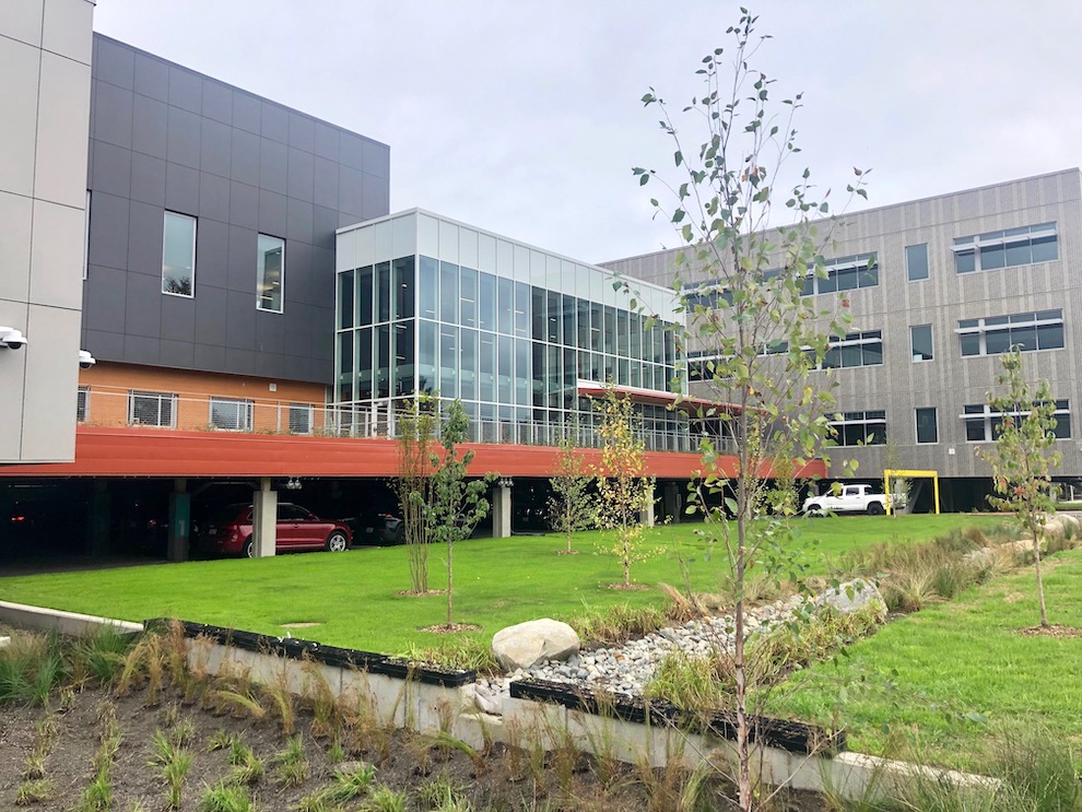 Space was utilized at every turn. Underneath the large cascading common area stairwells are food services spaces. Outdoor staircases incorporate built-in planters, creating seating areas. The elevated platforms are planted with a sea of sedums and other native plants. Innovative lunchroom tables transform into benches so common areas can be used as meeting and collaboration spaces.
