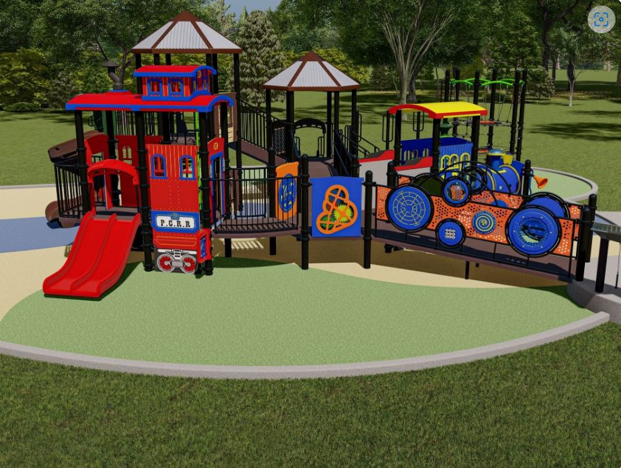 The new Riverview Park Playground will feature a railroad theme and includes a new swing set. It will also be accessible for wheelchairs, except for slides, and has rubber surface material – doing away with the playground’s current play chip base.