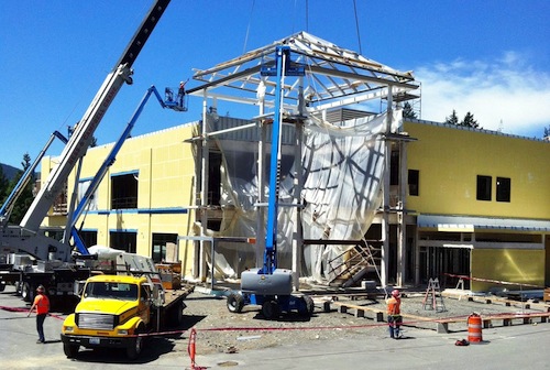 Architectural ‘tower cap’ piece being placed over entryway to new Snoqualmie Valley Hospital which opens March 2015