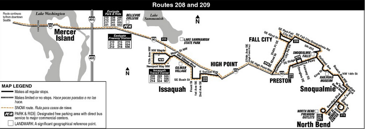 On weekdays and Saturdays, new Route 208 provides all-day service between North Bend and Issaquah via Snoqualmie Ridge. Route 208 will replace Route 209 routing on Boalch Ave NW and NW 14th St in North Bend.