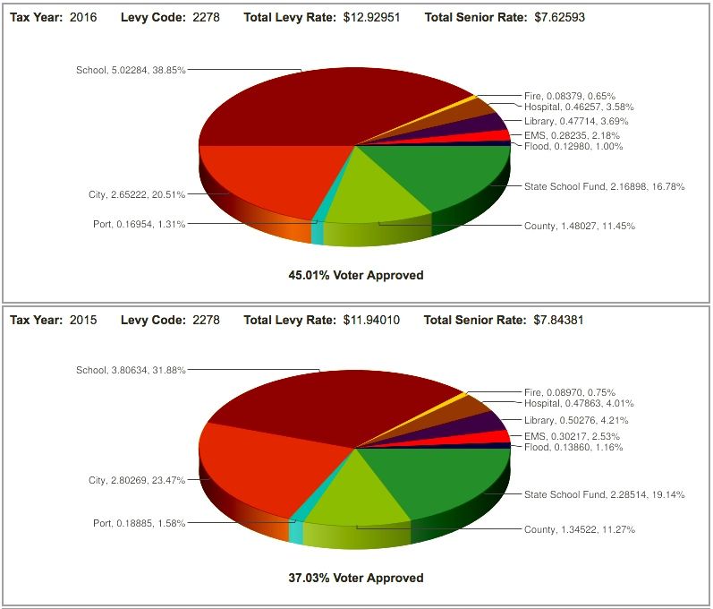 2015 and 2016 tax rate comparison charts for a Snoqualmie home. [Note: 2017 property tax bills are based on 2016 assessments.]