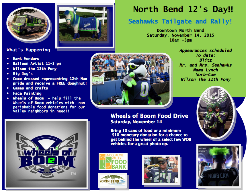 There’s some Seahawks fun heading to North Bend this weekend, Saturday, November 14, 2015 – and it also benefits the Snoqualmie Valley Food Bank. So grab all your blue and green gear (and some non-perishable food donations) and head to North Bend Way.