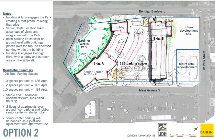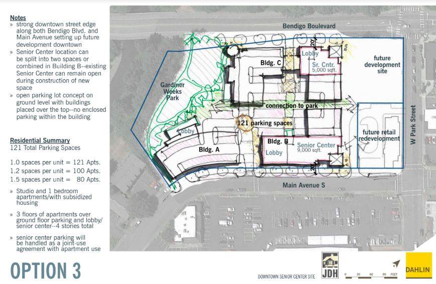 Some community benefits of the study noted by Miller include: affordable rents for those making $13-$20/hour; a new, redesigned senior center; added residents in the downtown area to support businesses; added downtown parking; productive use of city property as a subsidy/contribution to achieve affordability; potential office/retail space on Bendigo; possible riverfront park design.
