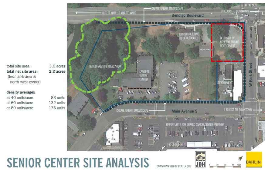 During the work session, local developer John Day presented a study he commissioned in which Dahlin Architects analyzed the 3.6 acre city-owned land parcel that currently contains the Mt. Si Senior Center and Snoqualmie Valley Historical Museum. The study explored how the site might be used to provide affordable/workforce housing in North Bend.