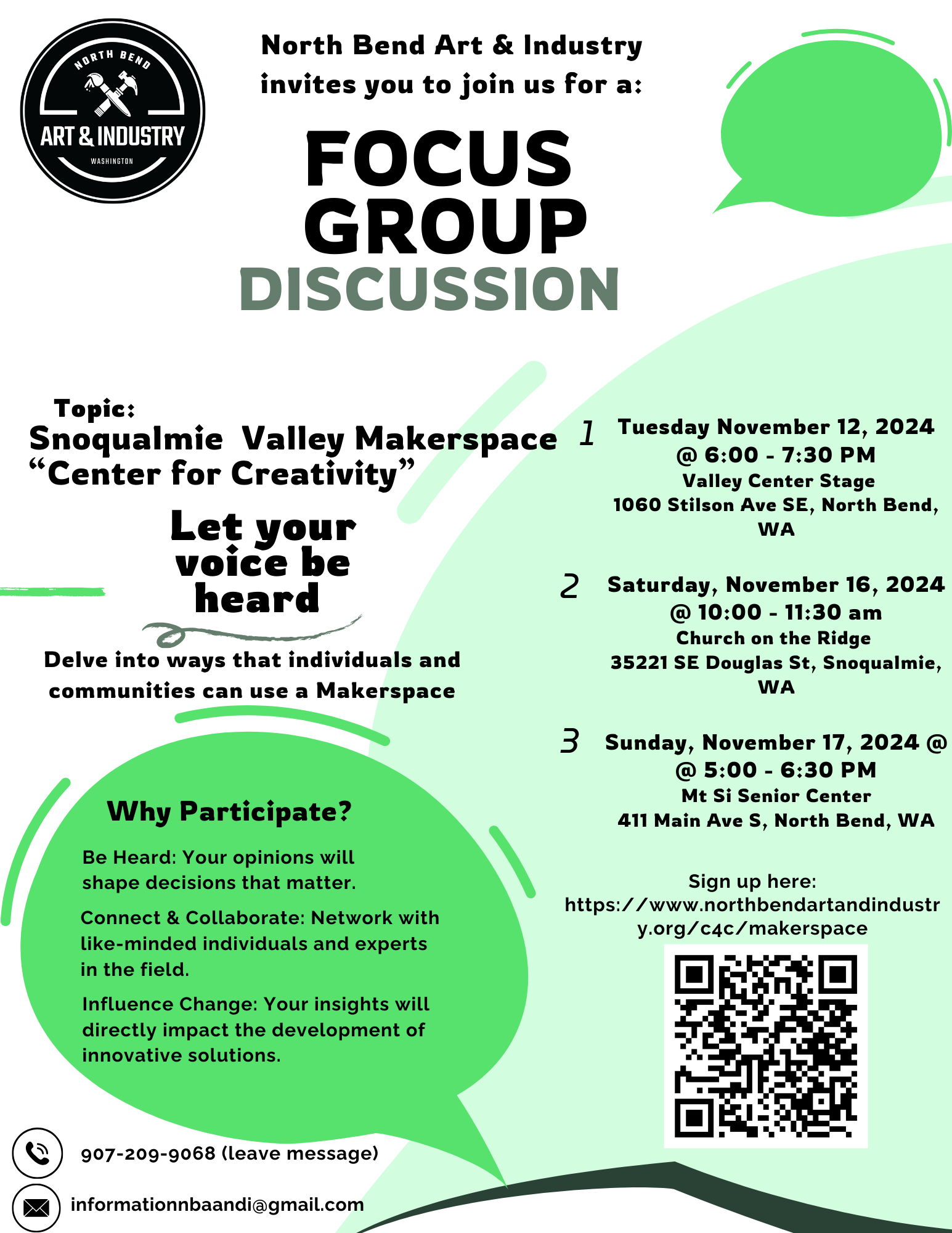 Join North Bend Art & Industry in crafting something remarkable. Whether you attend a focus group, fill out the survey, or send an email, your voice will help shape the Snoqualmie Valley Makerspace. Help NBA&I build a place where creativity has no bounds!