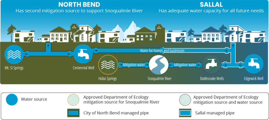 The illustration below shows how the City and Sallal’s Water Supply Agreement will work. The City will sell Sallal water for their homes and businesses, and Sallal will sell the City mitigation water. Learn more by visiting the East North Bend Water Update webpage.