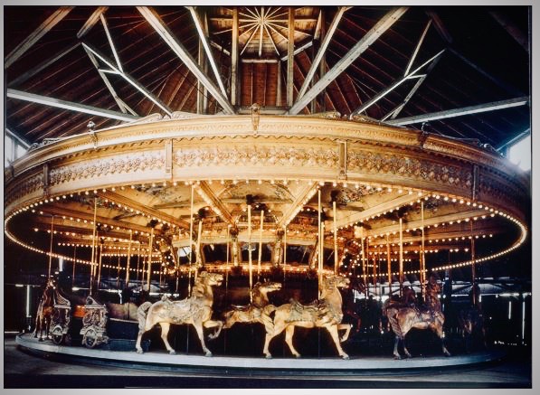 According to NBA&I board member Debra Landers, the mechanism has an interesting history. It was built by two famous carousel makers in the early 1900’s. Daniel Müller created most of the wood carvings, panels, and benches. Then the mechanism was purchased by Dentzel, who completed the carousel with the gears, motor, and decorative plaster.  It is believed to be the last carousel mechanism completed at the Dentzel factory in 1927.