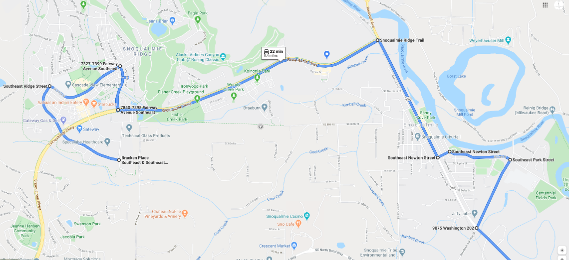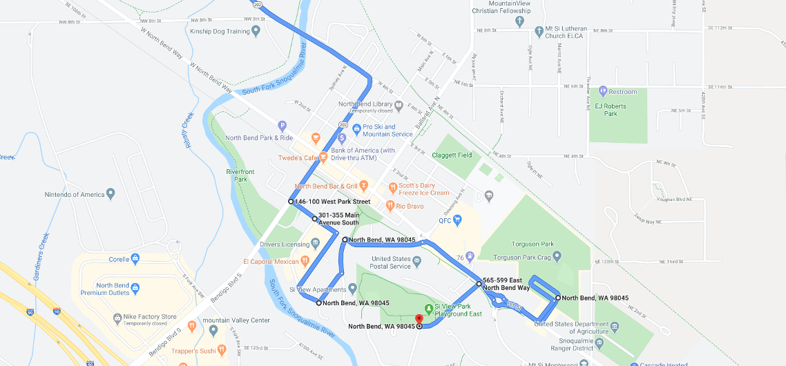 The parade will begin staging in Snoqualmie, on Bracken Avenue SE, between SE Center Street and SE Douglas Street, facing Douglas. At the start, the parade will proceed along Douglas, to SE Ridge Street, to Fairway and onto Snoqualmie Parkway/Railroad Avenue. In downtown Snoqualmie, the route will turn onto SE Newton Street, then onto Park Street, then onto Meadowbrook Way SE. From Meadowbrook, the parade heads into North Bend, turning onto Bendigo Boulevard, then onto W Park Street, Main Avenue SE, Stow Avenue S, E Park Street, North Bend Way, to Torguson Park. The parade turns around at the park back onto North Bend Way, following SE Orchard Drive to end at Si View Park.
