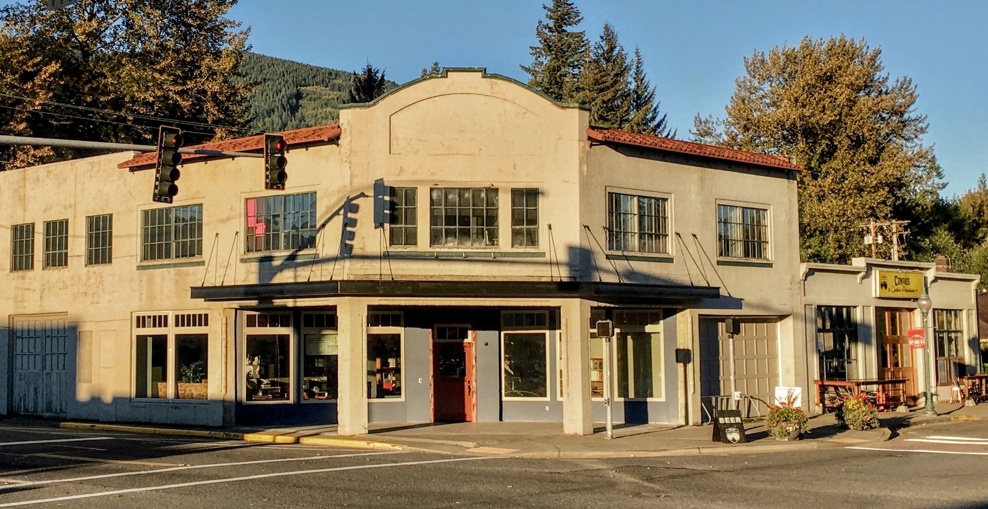 Major restoration work included: opening up the original drive-thu bay located at the busy downtown corner of Bendigo and North Bend Way and adding back the flat awning above it, along with reconstructing tile awnings above the storefront windows.