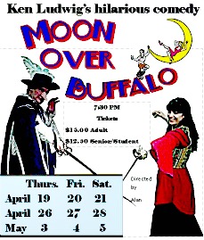 Moon Over Buffalo is a fast-moving comedy that centers on a family of actors trying to make a show come together. Set in the early 1950s in Buffalo, New York, former Broadway stars George and Charlotte Hay (Peter Cook and Denise Paulette) are reduced to playing Repertory Theater in Buffalo. Though they still dream of film stardom, they keep body and soul together with a half-deaf mother-in-law (Becky Rappin), their daughter, Roz (Lisa Bryant) and her ex-boyfriend stage manager Paul (Adam Hegg). With a lucky break, they are offered the chance to perform for Frank Capra, a famous Hollywood film director.