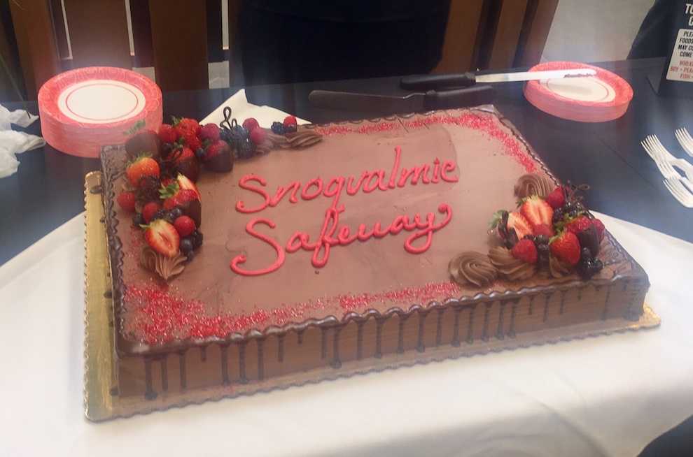 Hundreds streamed through the door – many cheering and some with phones recording the store’s interior – and immediately got to wandering, shopping and eating the large chocolate, ‘Snoqualmie Safeway’ welcome cake, which was gone within a few minutes.