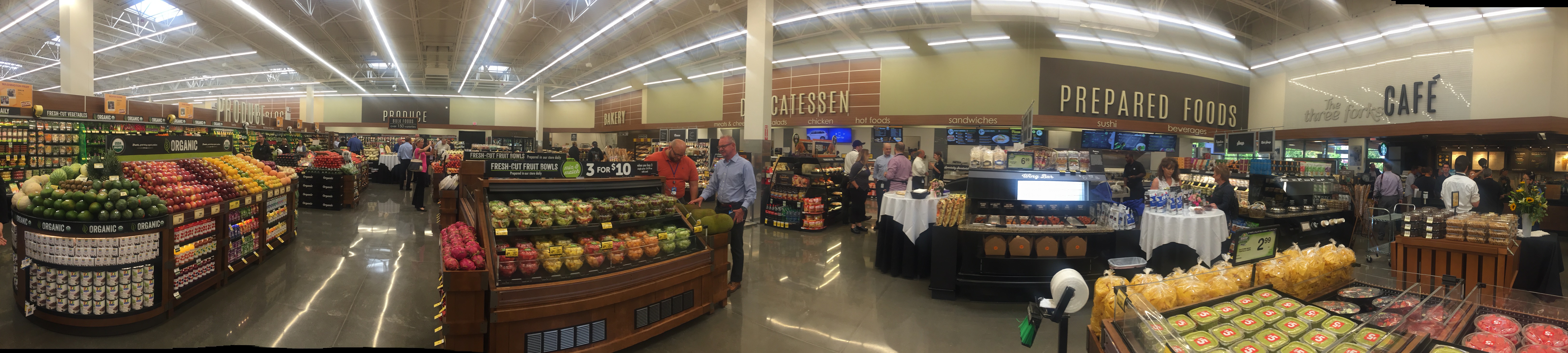 As promised by Safeway, the new store’s design is a departure from other Safeway’s in the area. The deli/bakery and produce areas are usually on opposites sides of the store, but not in Snoqualmie. If you enter through the west entrance, you walk straight in a large, produce, bakery, deli, prepared food and cafe section where you find everything you’d normally expect, plus an area where they do made-to-order pho, sushi, rice bowls, and wok meals – in addition to ready-made sandwiches, a large cheese case, and a salad and wing bar. [Click photo to enlarge panorama shot below.]